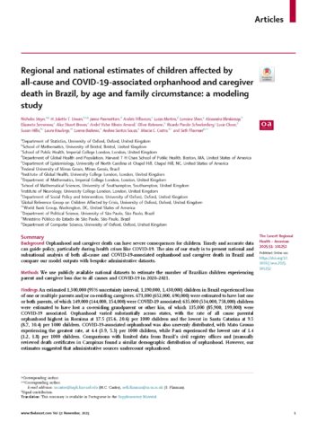 A orfandade e a morte de um cuidador podem ter consequências graves para as crianças. Dados oportunos e precisos podem orientar a política, principalmente durante emergências de saúde como a COVID-19. O objetivo do nosso estudo é apresentar análises nacionais e subnacionais da orfandade devido a todas as causas de morte de cuidadores e das mortes de cuidadores associadas à COVID-19 no Brasil e comparar os resultados com dados administrativos personalizados.